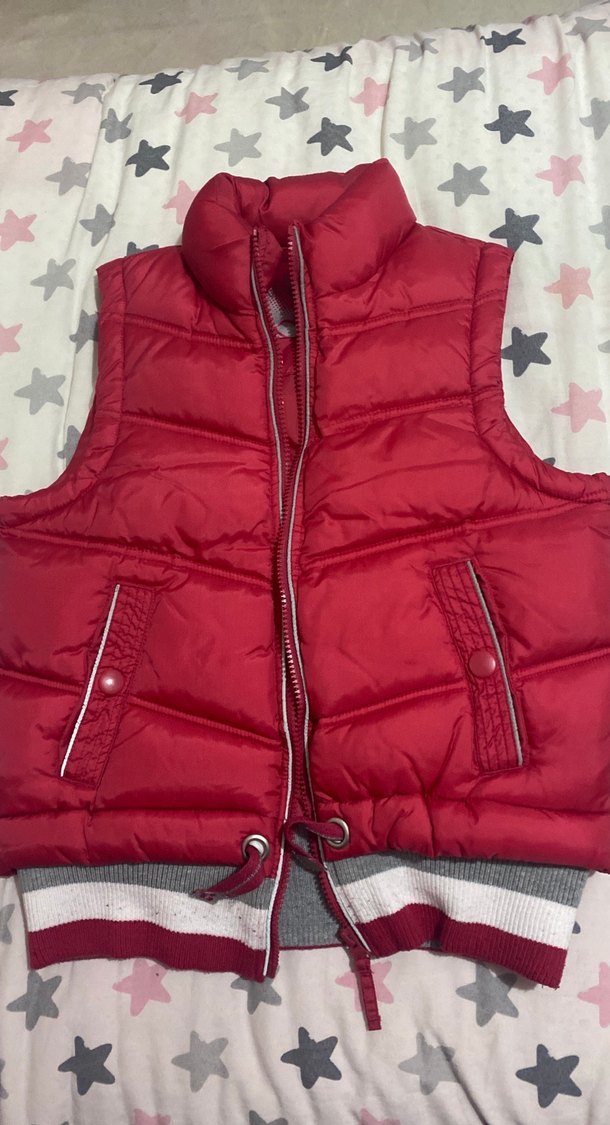 Kırmızı renk, fermuarlı ve düğmeli ceplere sahip, yaka detaylı, sıcak tutan kumaştan kız çocuk yeleği. Sokak stiline uygun, dar kesim ve çizgili etek ucu bulunur.