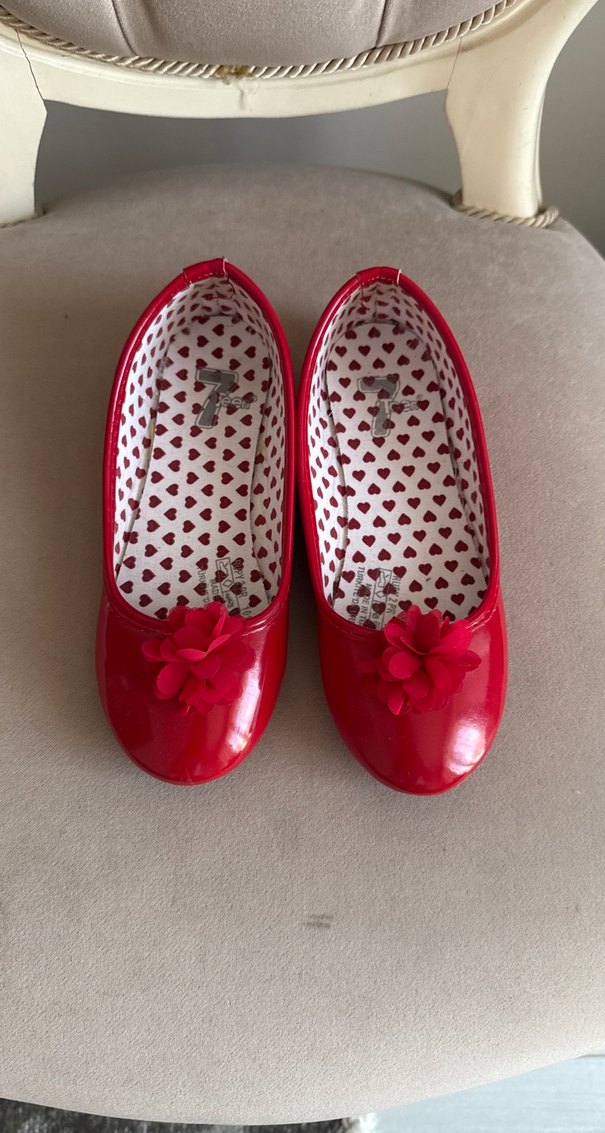 Kız çocuklar için kırmızı renkli, ön kısmında fırfır detaylı ve yumuşak kauçuk malzemeden yapılmış babet. İç kısmında kalp desenli astar bulunur. ❤️