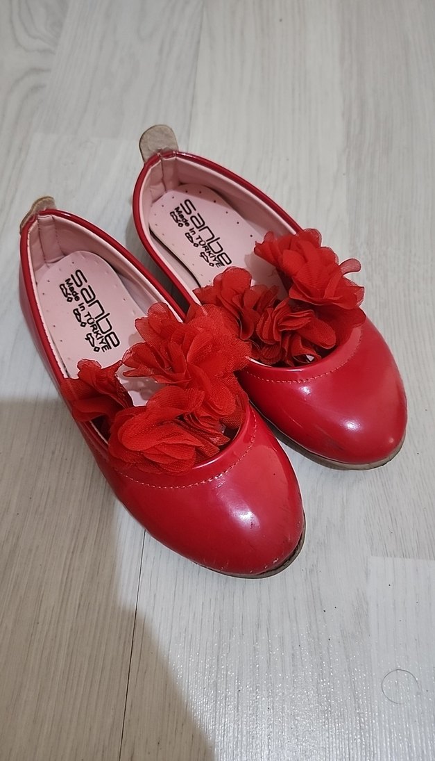 Kız çocukları için kırmızı renkli, lastik tabanlı ve çiçek desenli fırfır detaylı rugan babet ayakkabılar. cok az kullanıldı suya girmişti kızım o yüzden sağ ön kısımda hafif bir açılma var yapistirilabilir.. onun haricinde göründüğü gibi