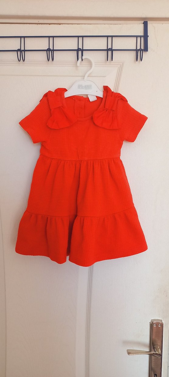 Kız çocuk elbise, fırfırlı yakası ve kısa kollu tasarımıyla dikkat çeker. Yumuşak ve sıcak kumaştan, rahat bol kesimlidir. Düz kırmızı renklidir ve günlük sokak stili için uygundur.