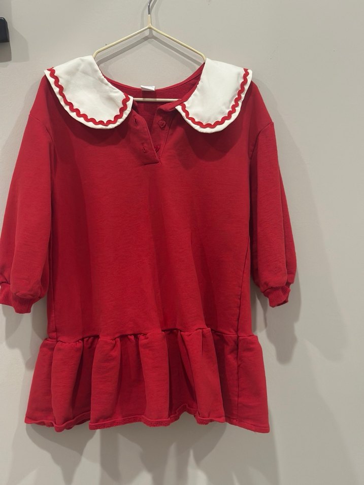 Kız çocukları için kırmızı uzun kollu, bol kesim elbise, fırfırlı etek ucu ve nakışlı beyaz yakaya sahiptir, yumuşak ve sıcak kumaştan üretilmiştir.