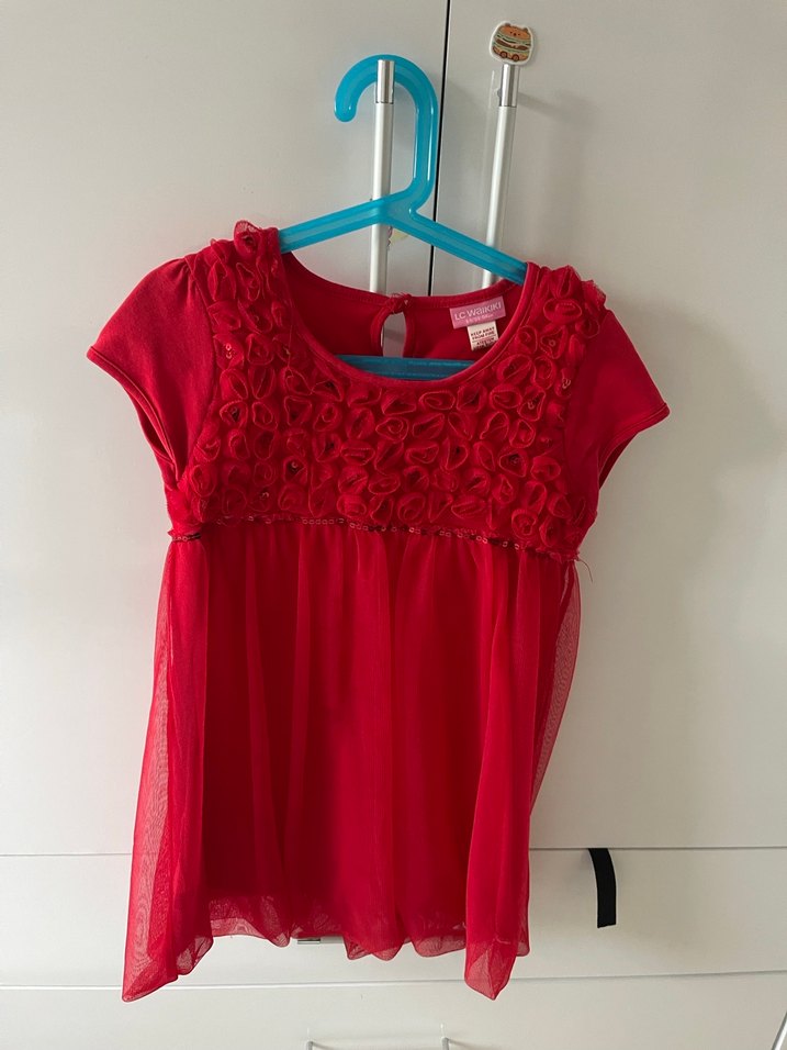 Kısa kollu, salaş kesim ve yuvarlak yakalı kız çocuk kırmızı elbise. Göğüs kısmında fırfır detayları vardır ve sentetik kumaştan üretilmiştir.