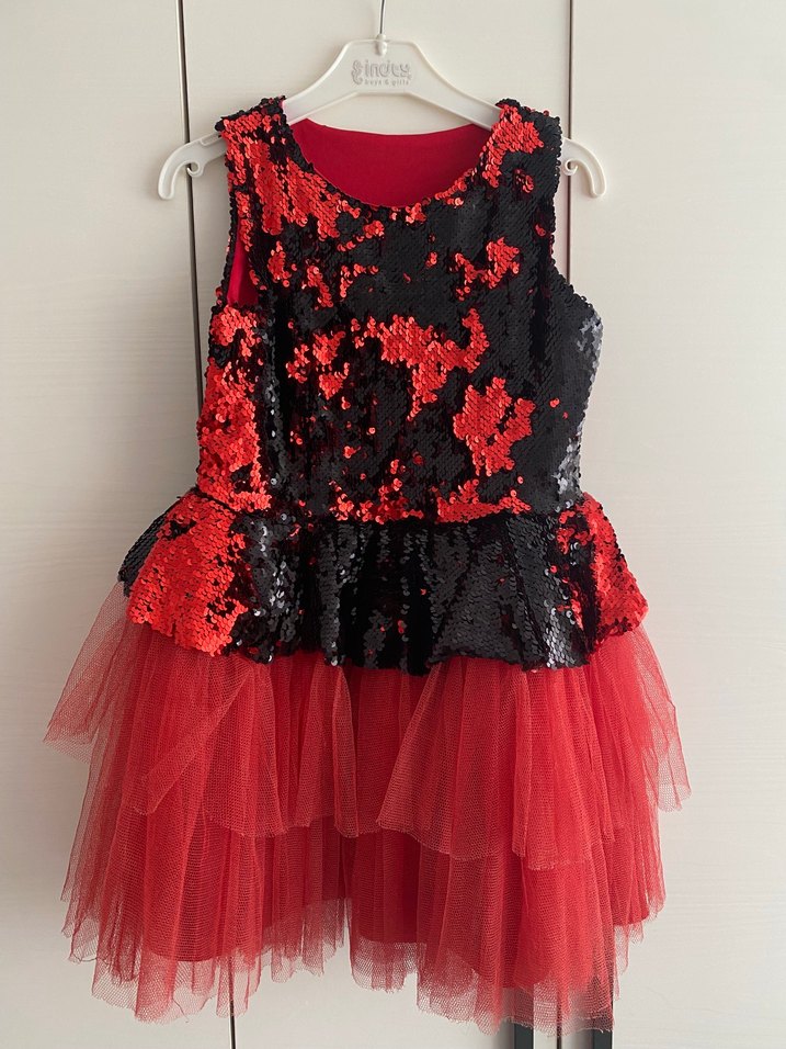 Kız çocuk için straplez yaka, kırmızı-siyah payetli gotik desenli, kolsuz, fırfırlı kat kat tül detaylı elbise. ✨