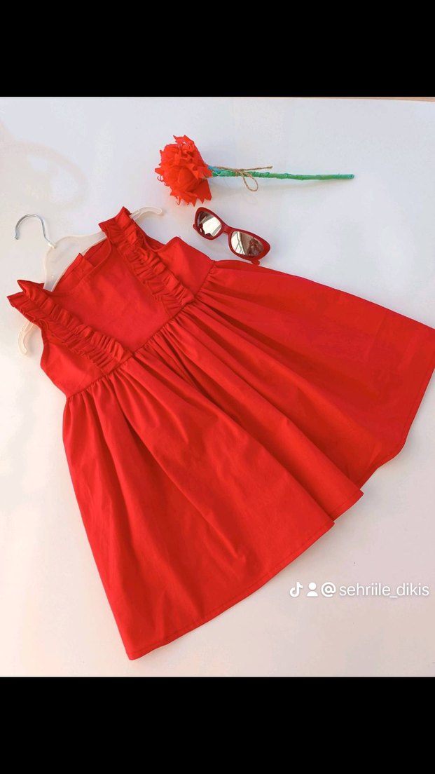 Renkli kırmızı elbise, fırfır detayları ve bol kesimi ile modern klasik tarzda, yumuşak pamuklu kumaştan üretilmiştir. 3 yaşa uygundur. özel dikimdir, iletişime geçilirse farklı yaş gruplarına da dikilir.
