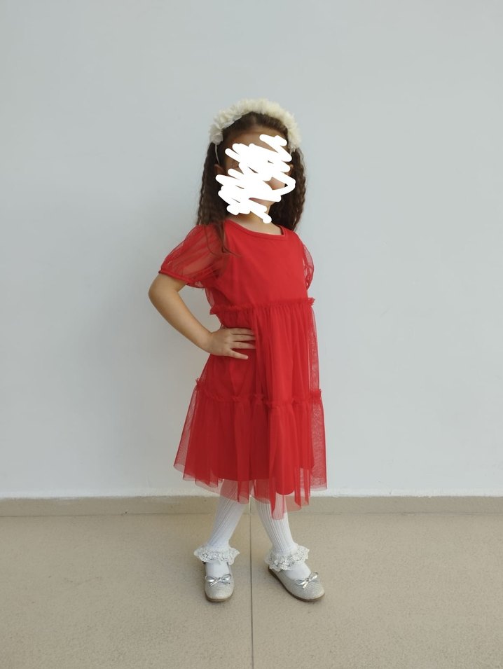 Kız çocuk kırmızı elbise, rahat kesim ve fırfır detaylara sahip. Sentetik yumuşak kumaştan.