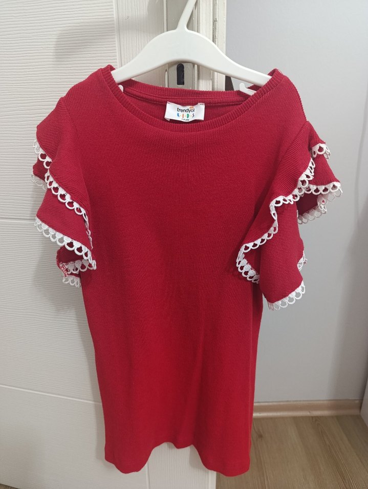 Kırmızı renkli, yuvarlak yakalı kız çocuk elbise, kısa kollu ve işlemeli fırfır detaylara sahiptir. Rahat kesimiyle trend sokak stili için uygundur.