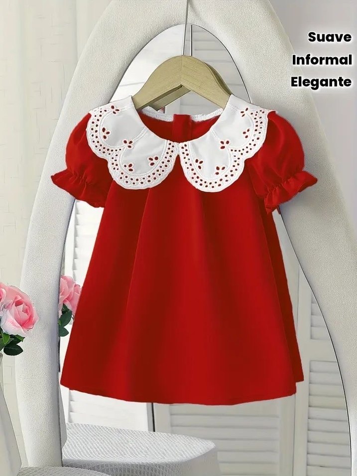Kız çocuk kırmızı elbise, gevşek kesim, kısa fırfırlı kollu ve beyaz nakışlı yakalıdır. Yumuşak kumaştan, modern klasik tarzda renkli detaylara sahiptir. ✨