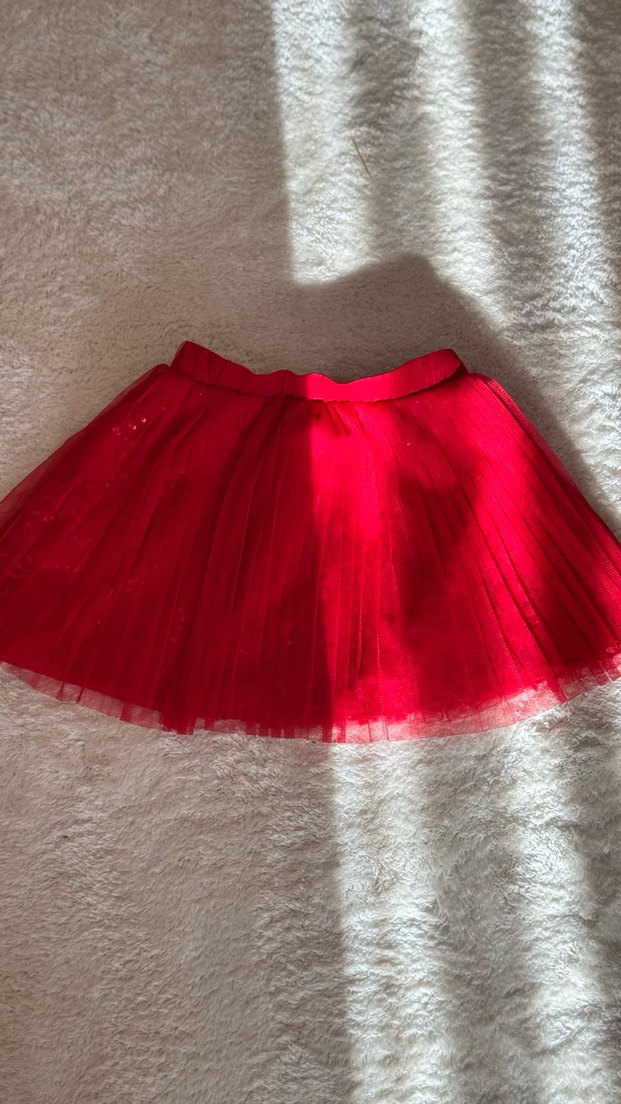 Kırmızı parlak renkte, fırfırlı detaylı, düz ve desen içermeyen kız çocuk etek, sentetik kumaştan ve dar kesimlidir.