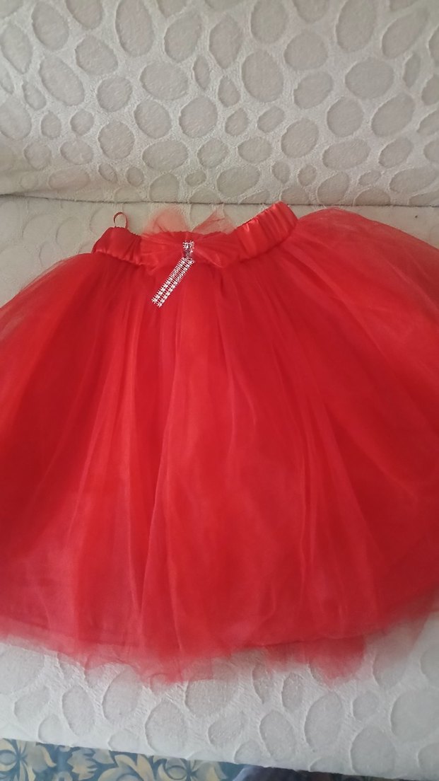 Kız çocukları için kırmızı, canlı renkte fırfırlı ve taş süslemeli, sentetik kumaştan, goth tarzına uygun dar kesim etek.