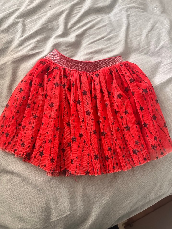 Renkli kırmızı kız çocuk eteği, sentetik kumaştan, bol kesim ve fırfır detaylı, yıldız desenli. Sokak tarzına uygun.