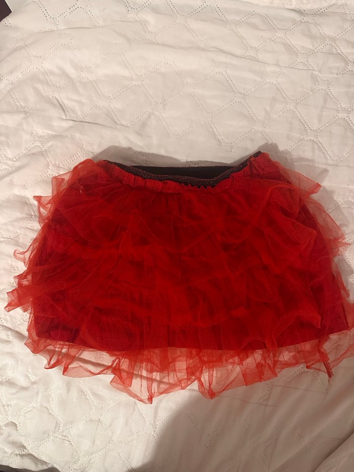 Kırmızı renkte, kat kat fırfır detaylı, gotik tarzda kız çocuk etek