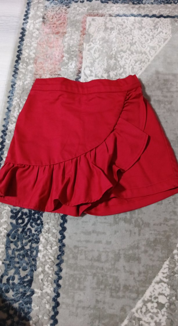 Kız çocuklar için kırmızı, oturan kesime sahip, fırfırlı detaylı, sentetik kumaştan üretilmiş etek. Trendy günlük ve sokak modasına uygun. şort etek