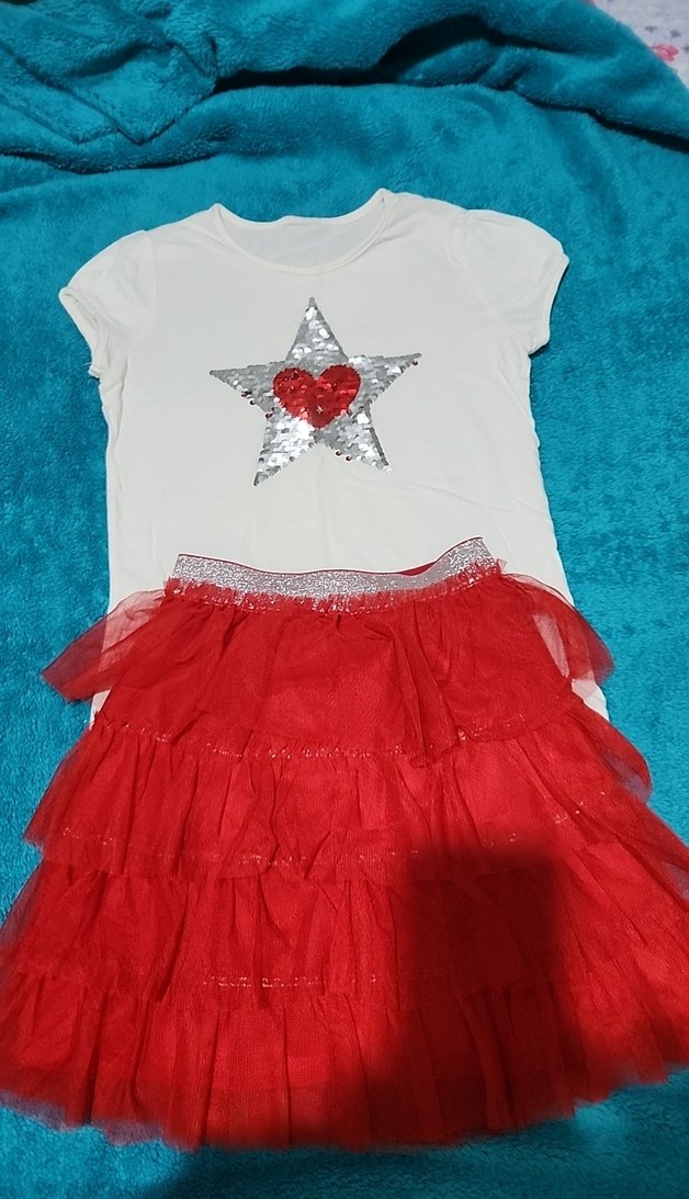 Yumuşak sentetik kumaştan yapılmış, renkli ve fitted kırmızı fırfırlı etek, beyaz kısa kollu, yıldız ve kalp nakışlı tişörtle kombinlenmiştir. ✨
