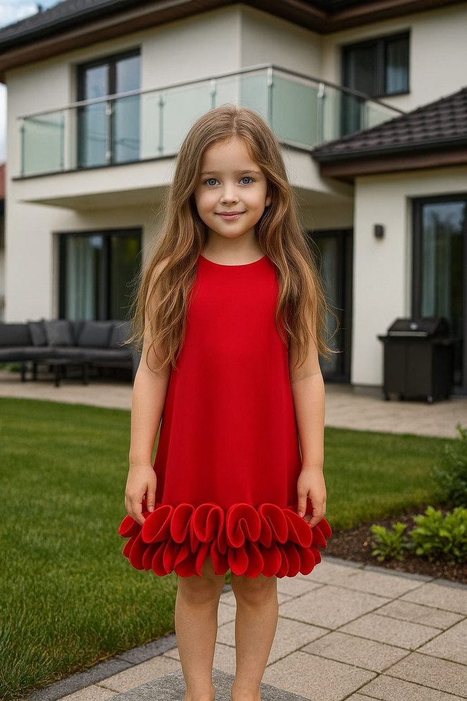 Yumuşak skuba kumaştan, kolsuz ve straplez yakalı, bol kesim kırmızı elbise. Etek kısmında işlemeli ve fırfırlı detaylar bulunur. #cocukabiye