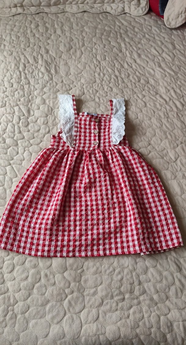Renkli kırmızı kız çocuk elbisesi, straplez yaka ve nakış detaylıdır. Yumuşak triko kumaştan, fırfırlı ve salaş kesim vintage tarzda, kolsuzdur.İki ya da üç kez giyildi ürün tertemiz .