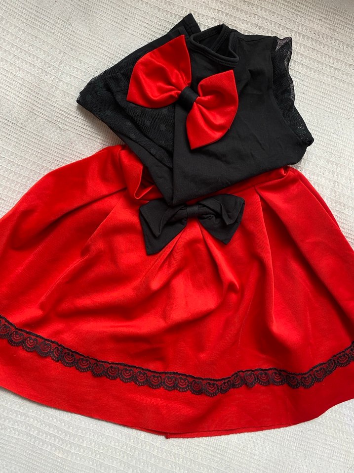 Renkli kırmızı etek, yumuşak ve sıcak kumaştan, nakışlı detaylar ve fırfırlı bel ile geniş kesimdir. Siyah fiyonk ve dantel süslemelidir.