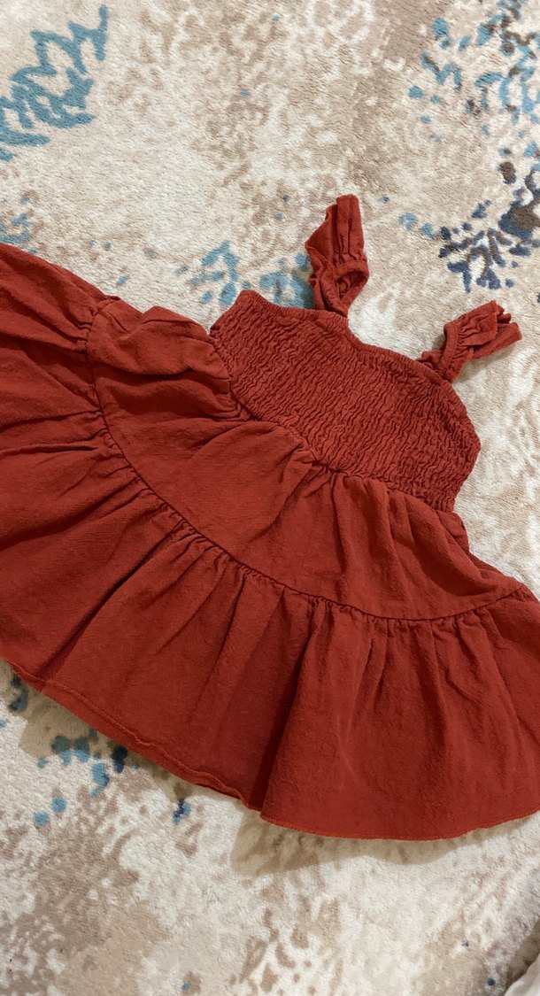 Kız çocuklar için pamuklu, bohem tarzda kırmızı elbise. Fırfır detaylı, nakışlı, askılı ve straplez yaka ile rahat ve bol kesim. 9-12 yazıyor ama bence 12-18 de uyumlu