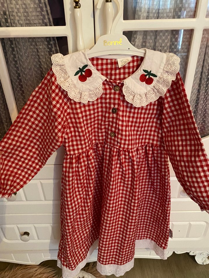 Kız çocukları için kırmızı pamuklu elbise, uzun kollu ve bol kesimdir. Beyaz fırfırlı yakasında renkli kiraz nakışı bulunur, bohem ve nostaljik stil sunar.