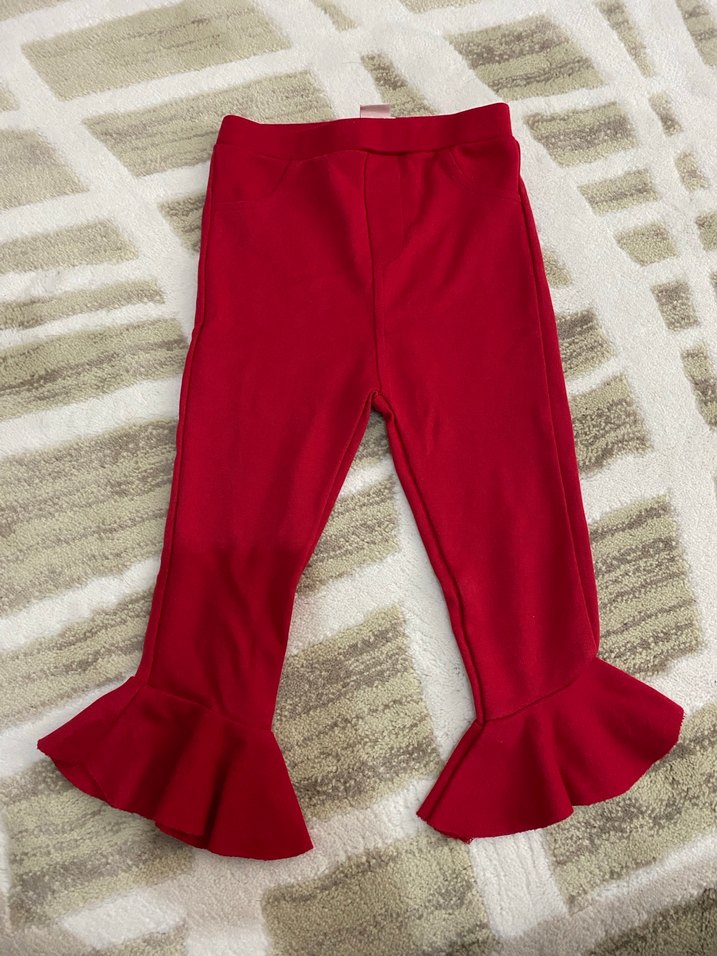 Kız çocukları için kırmızı, yumuşak ve sıcak kumaştan yapılmış, fırfırlı paçası olan dar kesim taytlar.