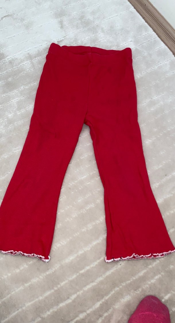 Kız çocukları için kırmızı, yumuşak ve sıcak kumaştan, paçalarında fırfır detaylı tayt. Sade ve renkli, günlük sokak stili için uygun.
