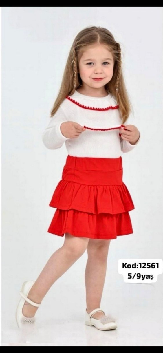 Kız çocuklar için renkli nakışlı ve fırfırlı, kırmızı triko kumaştan yapılmış dar kesim etek. 5-9 yaş arası. Kod:12561 almadan önce beden sorunuz #kızçocuk #abiye #elbise #7yaş #çocuk