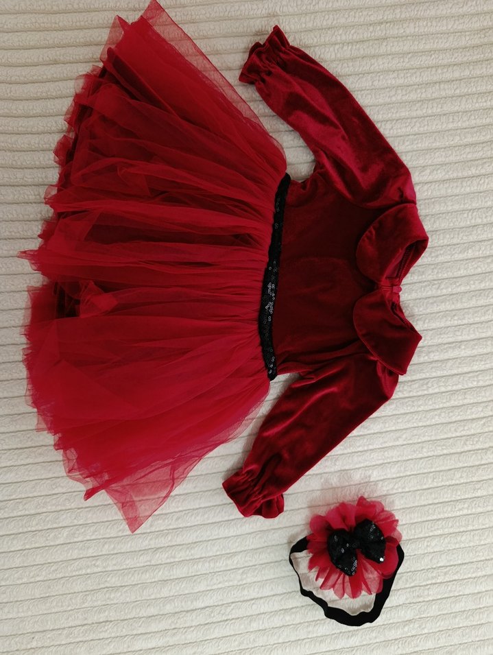 özel dikim. Kırmızı, uzun kollu, yakalı ve vücudu saran kız çocuk elbisesi, yumuşak sentetik kumaştan, siyah kemerli ve kat kat fırfırlı etekli. Uyumlu saç bandı dahil.