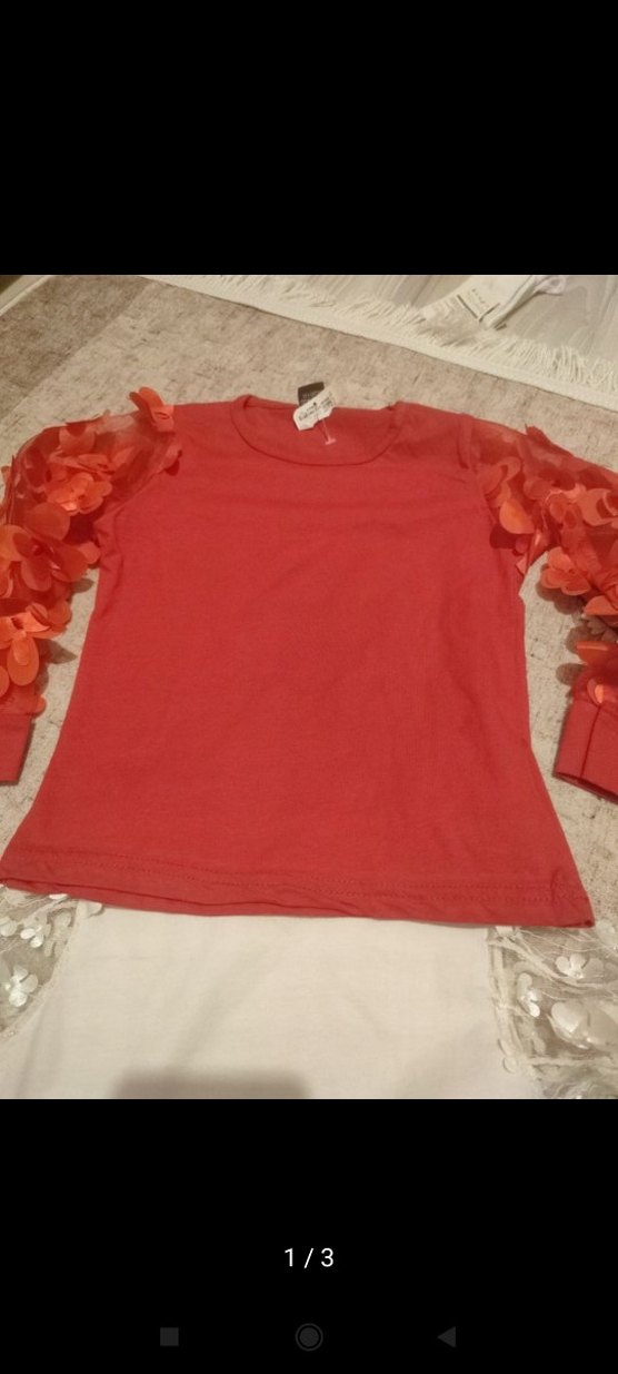 Kız çocuk tişörtü, uzun kollu ve fırfırlı detaylara sahiptir. Yuvarlak yaka ve bol kesimlidir, renkli sentetik kumaştan üretilmiştir.