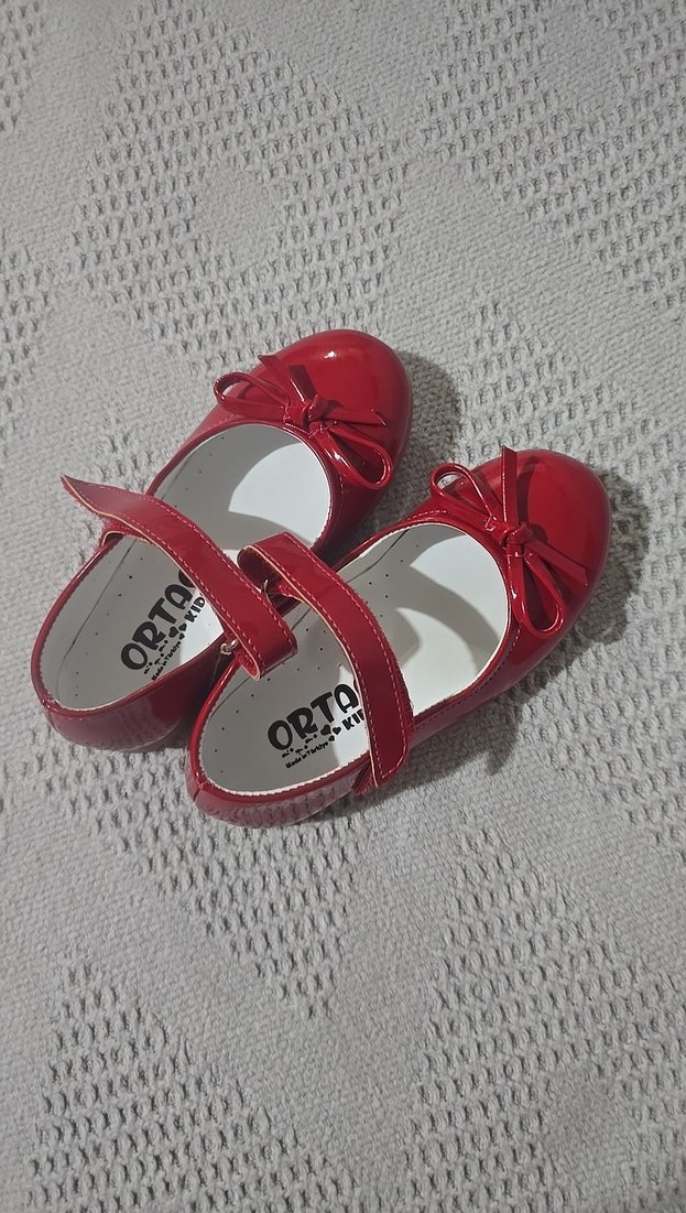 Kız çocuklar için kırmızı renkli, fiyonk detaylı ve klasik tarzda, kauçuk malzemeden yapılmış babet ayakkabı. İç kısmında ORTO yazısı bulunur.