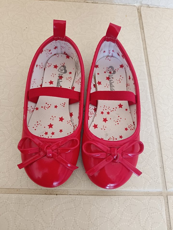 Kırmızı renkli, fiyonk detaylı kız çocuk babetleri. Kauçuk malzemeden üretilmiş, yıldız desenli taban ve üstte bant bulunur.