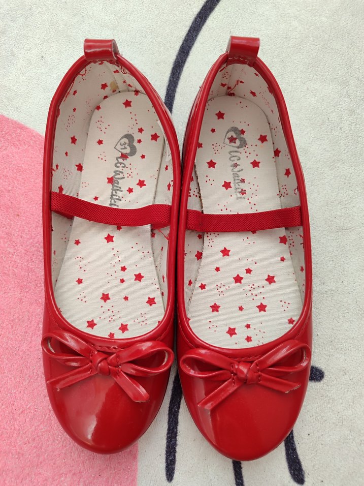 Kız çocuklar için kırmızı renkli, fiyonk detaylı babet. İç tabanı renkli yıldız desenli, parlak ve pürüzsüz malzemeden üretilmiştir.