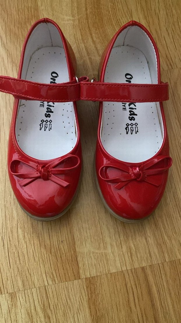 Parlak kauçuk malzemeden yapılmış, fiyonk detaylı kırmızı kız çocuk babetleri. Klasik kayışlı ve sade tasarıma sahiptir.