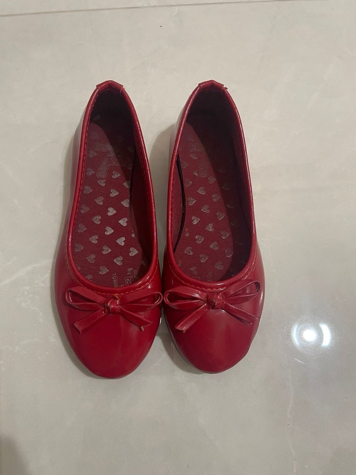 Kız çocuklar için kırmızı, fiyonklu ve düz görünümlü babetler. Canlı renkli, kauçuk malzemeden, desen içermeyen rahat ayakkabılar. Gösteri icin birkac sefer giyildi sıfır ayarındadır