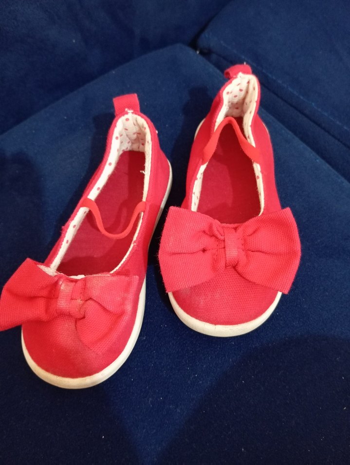 Kırmızı renkli, fiyonklu kız çocuk babetleri, düz tasarımda ve kauçuk tabanlıdır.