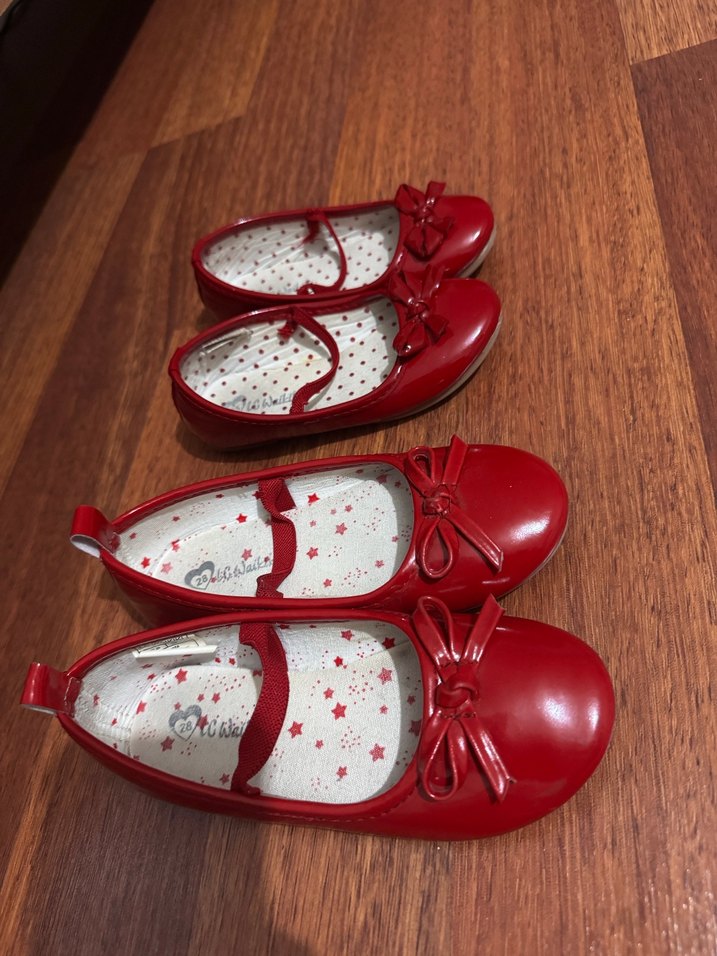 Kırmızı renkte, ön kısmında fiyonk detayı bulunan, sade ve klasik tarzda kız çocuk babeti. İç kısmı renkli ve yıldız desenlidir. İki adet var elimde 25 numara sadece evde giyildi. 28 numara da çok az giyildi. Ayağını sıktığı için giyemedi