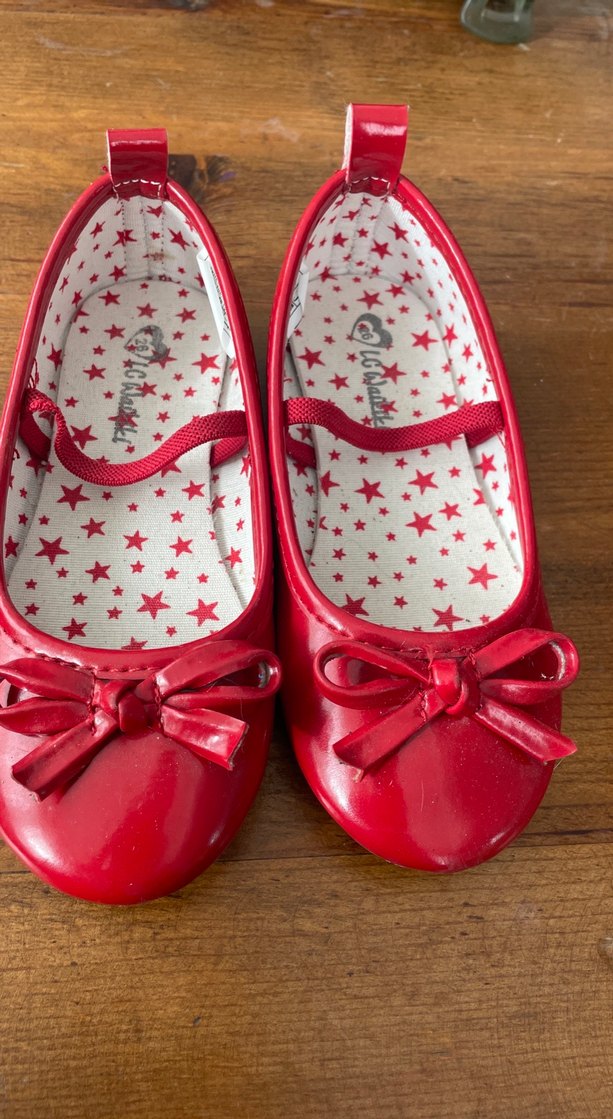 Parlak kırmızı renkte, kız çocukları için fiyonklu babet ayakkabı. İç tabanı yıldız desenlidir ve esnek kauçuk malzemeden yapılmıştır. 23 Nisan töreni için alındı bir kez giyildi