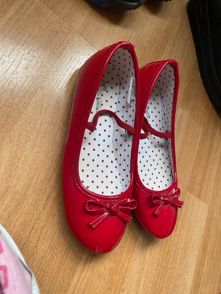 Kırmızı renkli, fiyonklu kız çocuk babet ayakkabı. İç kısmı renkli puantiyeli ve lastik malzemeden yapılmıştır. Geleneksel stilde.