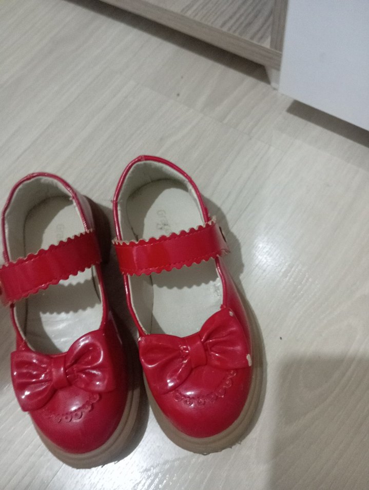 Kız çocuklar için kırmızı renkte, lastik malzemeden yapılmış, ön kısmında fiyonk detayı bulunan babet ayakkabılar. Basit ve renkli, klasik tarzda, bantlı tasarımıyla dikkat çeker.