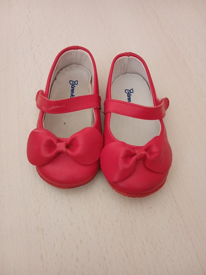 Kırmızı renkte, fiyonklu kız çocuk babet ayakkabı. Kauçuk malzemeden yapılmış, sade ve renkli klasik tarzda. numara 20