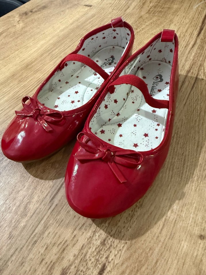 Kız çocukları için fiyonklu, renkli yıldız desenli iç astarlı klasik kırmızı babet ayakkabılar. Kauçuk malzemeden yapılmıştır. Lcw az giyildi