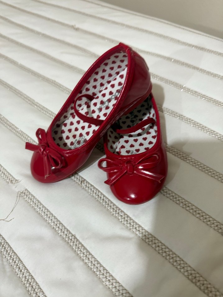 Kız çocuklar için kırmızı renkli, lastik malzemeden yapılmış fiyonklu babet ayakkabılar. İç kısmı kalp desenlidir ve klasik bir tarz sunar.