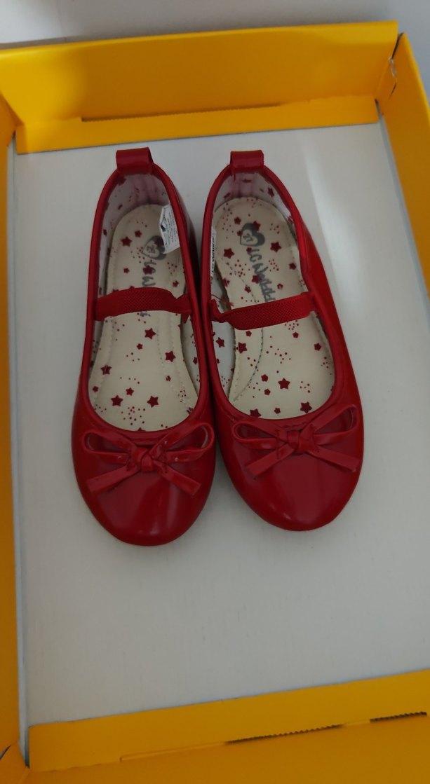 Kız çocukları için kırmızı parlak babet ayakkabılar, üzerinde fiyonk ve ayakta rahat tutan bant ile. İç tabanı yıldız desenlidir.
