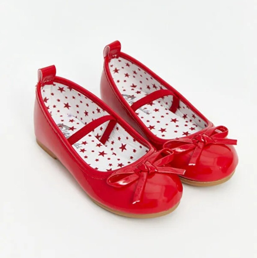 Kız çocukları için kırmızı bale ayakkabısı, modern klasik tarzda, fiyonk detaylı ve renkli yıldız desenli iç astara sahip. Kauçuk malzemeden üretilmiştir.