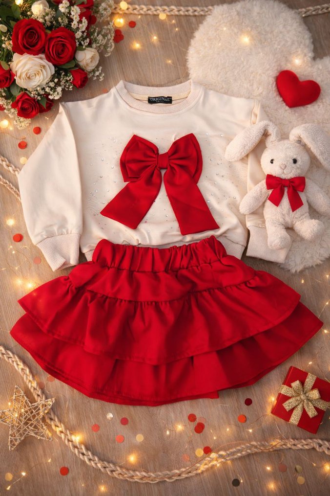 6/12 yaş Kız çocuk elbisesi, uzun kollu ve yuvarlak yakalıdır. Yumuşak, sıcak kumaştan üretilmiş olup, nakış deseni ve önünde büyük kırmızı fiyonk bulunmaktadır. Açık renk üst ve canlı kırmızı kat kat etek klasik şıklığı ve rahatlığı birleştirir.