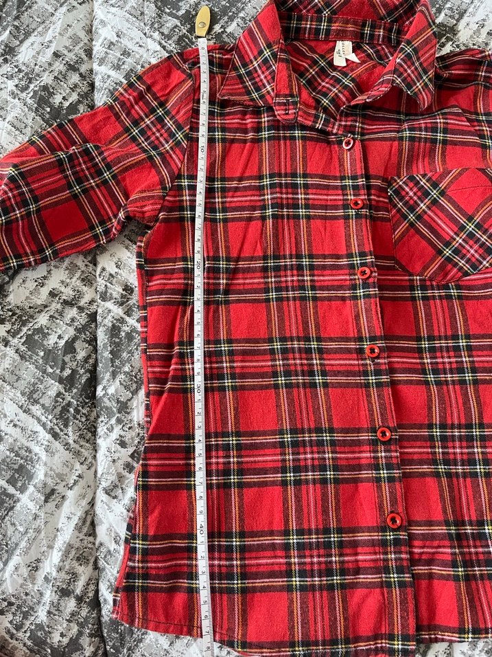 Düğmeli, uzun kollu, notalı yakalı kırmızı ekose desenli, sentetik kumaştan yapılmış, rahat ve sokak tarzı kız çocuk gömleği.