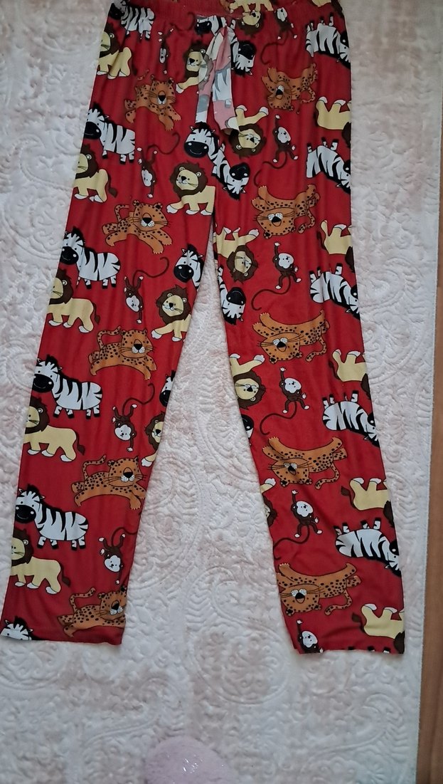 Kırmızı zemin üzerine zebra ve aslan desenleriyle renkli, bol kesim kız çocuk pantolonu, yumuşak ve sıcak dokulu kumaştan yapılmıştır.