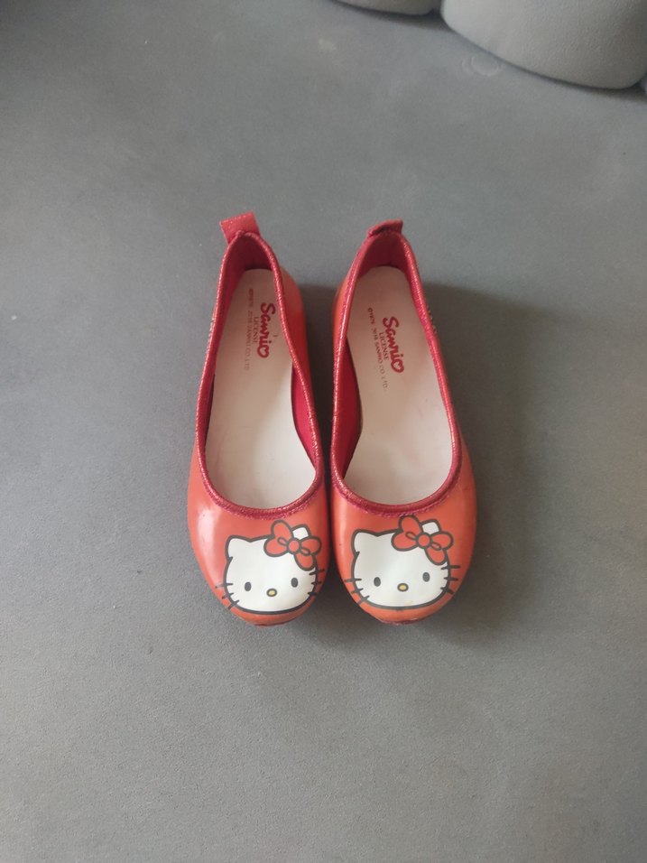 Kırmızı kauçuk kız çocuk babet ayakkabılar, uç kısmında Hello Kitty deseni ve tokalı detay içerir. Trend sokak stili için uygundur.