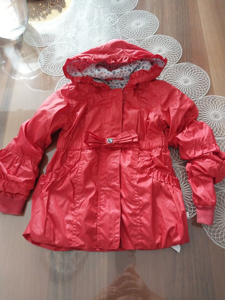 Kız çocukları için kırmızı, kapüşonlu, düğmeli ve sentetik kumaştan yapılmış dar kesim ceket. Düz ve renkli tasarıma sahiptir, günlük sokak stiline uygun.