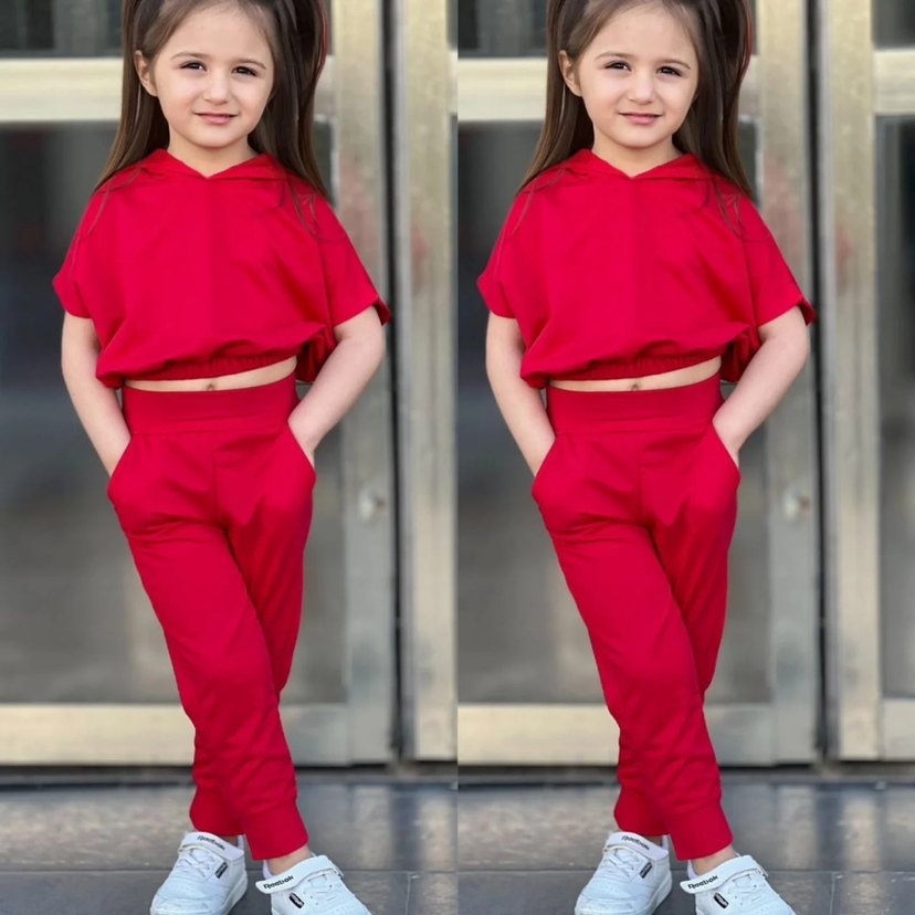 Kız çocukları için yumuşak fleece kumaştan, kapüşonlu ve kısa kollu, rahat kesim kırmızı eşofman takımı. Sade ve şık tasarım, günlük kullanıma uygun.