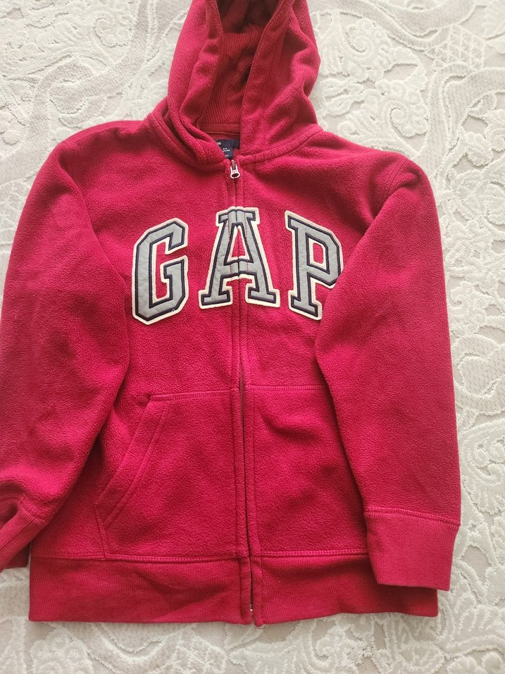 Kız çocuklar için kırmızı, kapüşonlu ve fermuarlı sweatshirt. Yumuşak ve sıcak kumaştan, GAP logosu ön tarafta, sade ve desensiz tasarım.