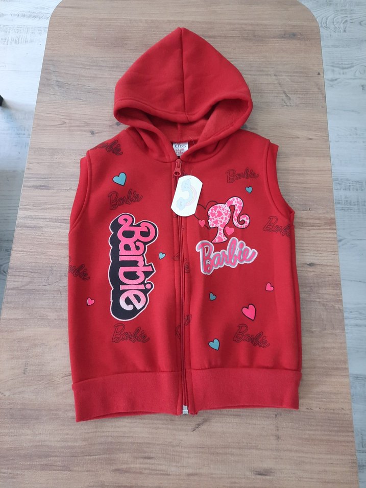 Kız çocuklar için kapüşonlu, fermuarlı kırmızı yelek. Yumuşak fleece kumaştan, renkli Barbie baskılı, dar kesim sokak tarzı yelek.